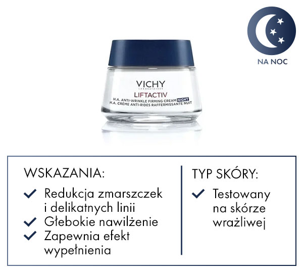 Poszukujesz dobrego kremu przeciwzmarszczkowego na noc? Twojej uwadze polecamy przeciwzmarszczkowy krem ujędrniający z kwasem hialuronowym na noc LIFTACTIV. Nieklejąca się formuła szybko się wchłania, głęboko nawilżając skórę. Tuż po przebudzeniu można zauważyć, że skóra wydaje się jędrniejsza i bardziej napięta, a zmarszczki wyglądają na zredukowane. To zasługa nie tylko kwasu hialuronowego, ale też witaminy Cg (glukozyd askorbylu) i frakcji probiotycznych, które wzmacniają barierę ochronną skóry.